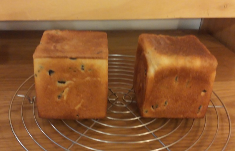 틀의 뚜껑을 닫고 큐브 모양으로 만들어 본 식빵